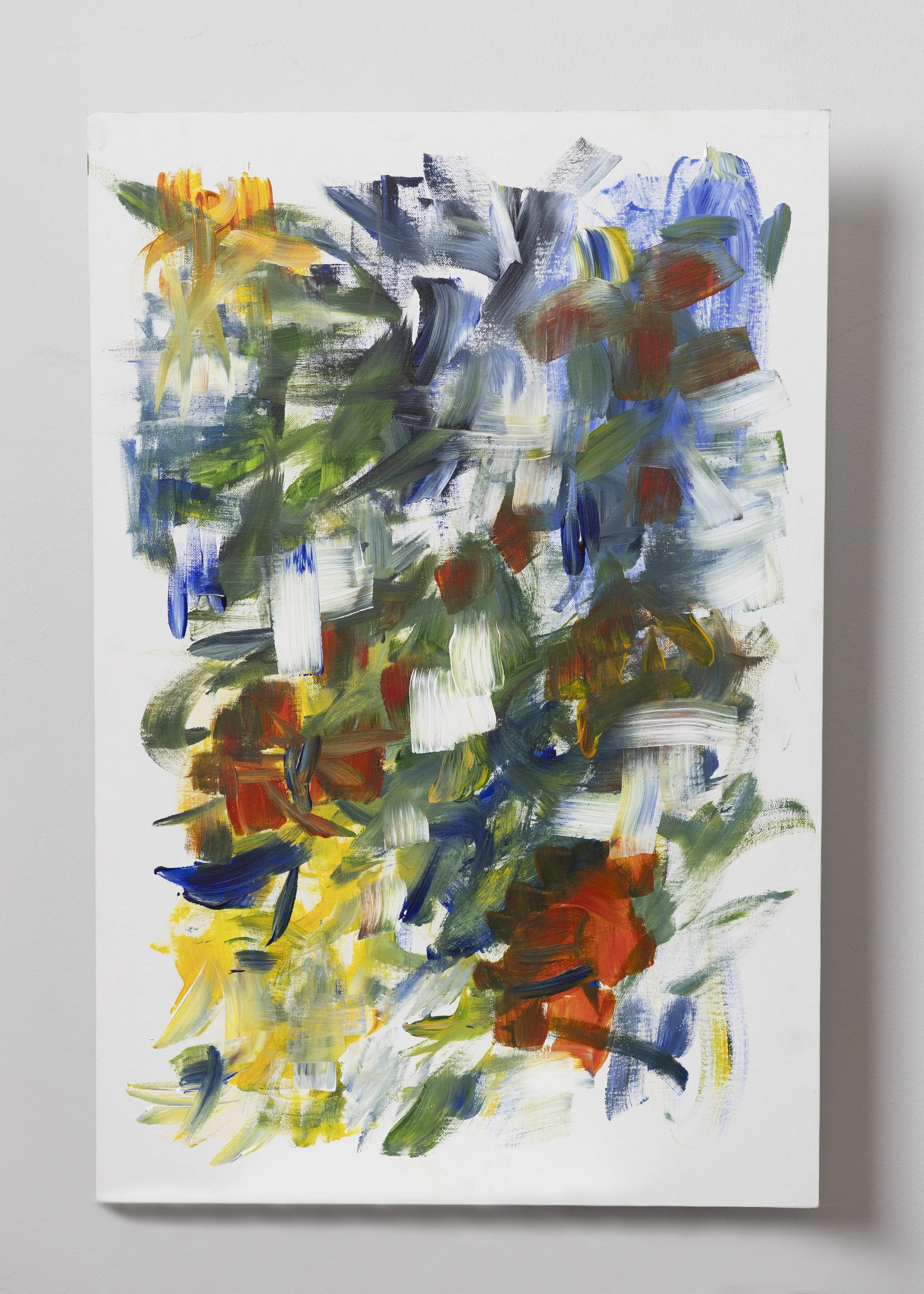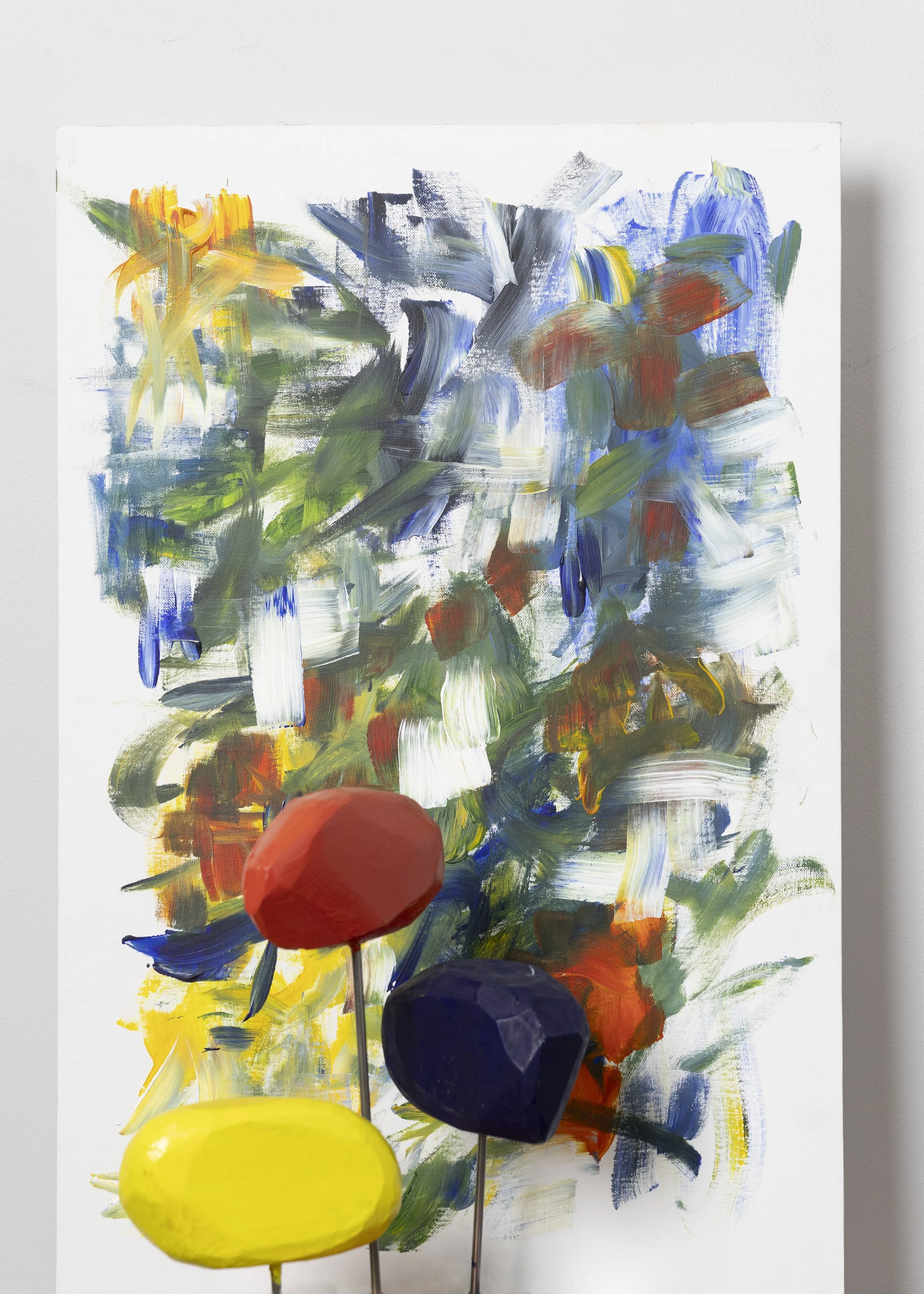 Gestural abstraction inspired by Joan Mitchell, reimagining flowers as energetic brushwork with accompanying carved wooden sculptures that pull forms off the canvas into physical space.